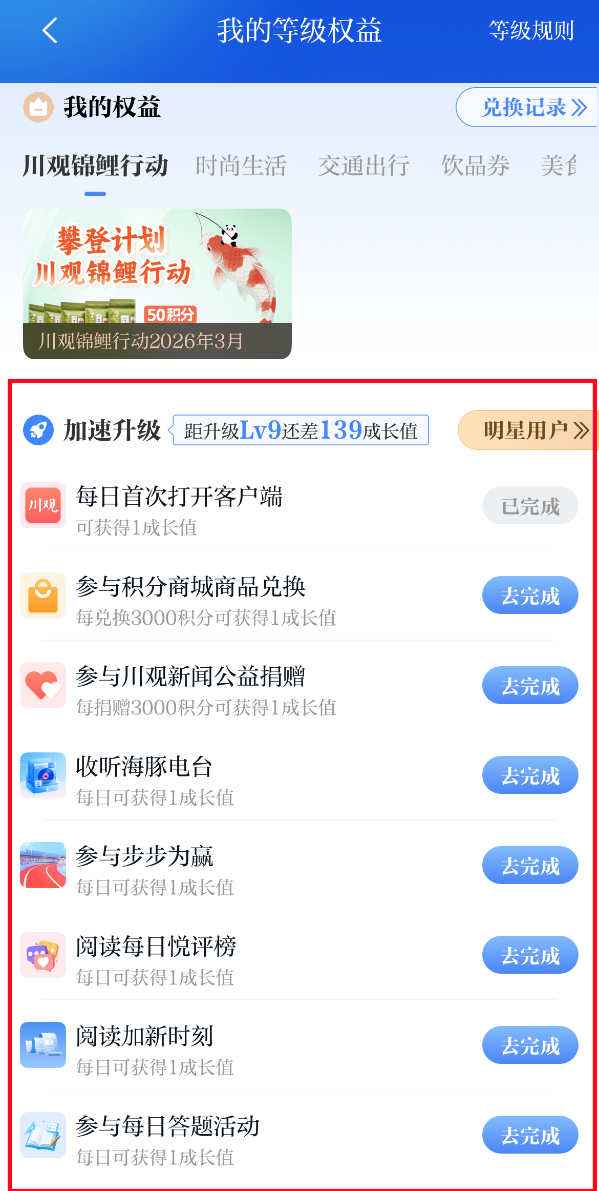 第四步:点击“去完成”,即可根据提示获取成长值。
