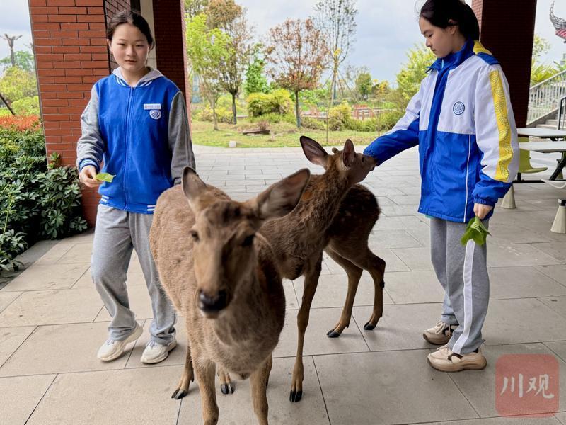 2026年3月29日,四川广汉中学春意融融,梅花鹿、鸵鸟、孔雀、黑天鹅等近20种动物与学子和谐共处,成为校园独有的温情风景。