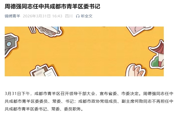 3月31日下午,成都市青羊区召开领导干部大会,宣布省委、市委决定。周德强同志任中共成都市青羊区委委员、常委、书记;成都市政协党组成员、副主席何勋同志不再担任中共成都市青羊区委书记、常委、委员职务。