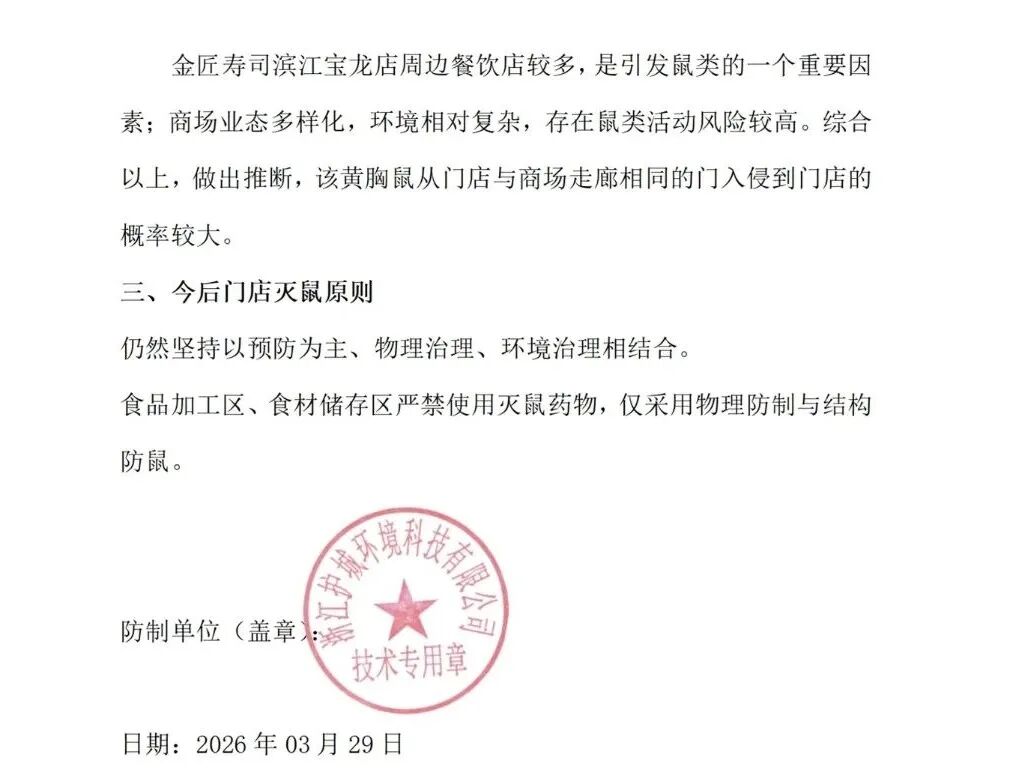 金匠寿司一直严格执行定期、合规的虫害防治工作,且均有相关报告记录。在此次事件发生前,该门店所有虫害防治记录中均未发现老鼠踪迹。经初步核实,本次事件中的老鼠系从外部入侵,并非本店自身滋生。