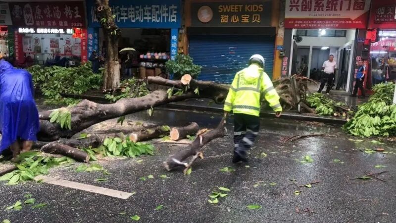 当日9时许,海珠区南华中路忆海湾对出路边有一棵大树被暴风雨吹倒,导致一条车道受阻无法通行。海珠分局海幢派出所民警梁矩标立即赶赴现场,配合市公安局交管支队等部门疏导交通,等待三防救援部门到场处置,全力保障市民出行安全。