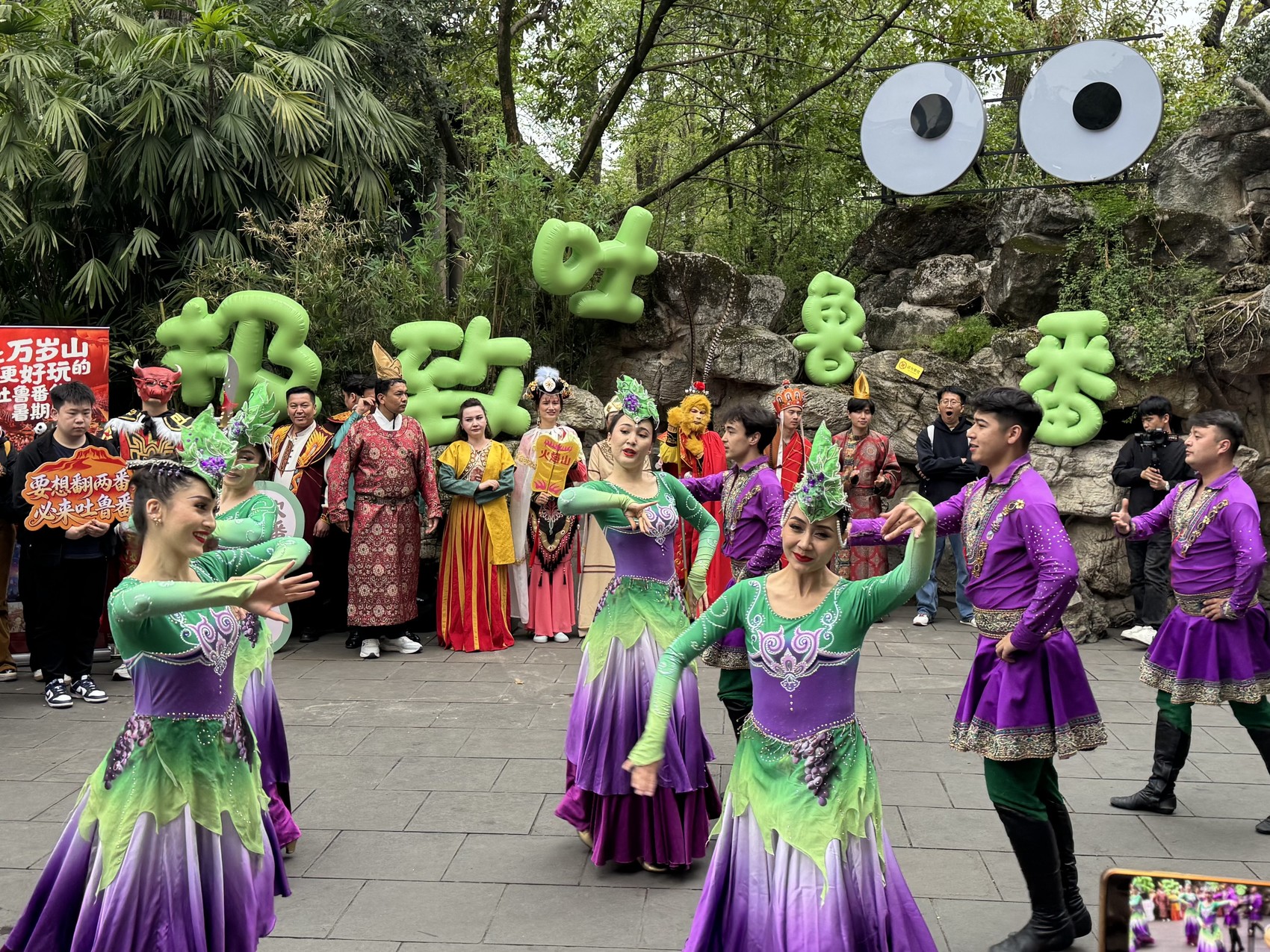 3月30日至31日,吐鲁番文旅快闪活动先后亮相成都大熊猫繁育研究基地、武侯祠、锦里、成都印象城等成都知名地标,设置风物展陈、特色歌舞、沉浸式巡游三大核心板块,为蓉城市民与游客带来兼具丝路底蕴与互动趣味的文旅盛宴。在 “极致吐鲁番下午茶” 主题展区,吐鲁番特色物产与非遗文创集中亮相,让现场观众沉浸式感受丝路风物之美;吐鲁番市歌舞剧团演员倾情献演,《吐鲁番的葡萄会唱歌》《天竺少女》等经典舞蹈尽显浓郁民俗风情,二重唱《请到吐鲁番》深情发出文旅邀约,器乐合奏《青春舞曲》、集体舞《现代纳孜库姆》接连点燃现场氛围,更邀请现场观众互动共舞,尽显吐鲁番的热情与活力。