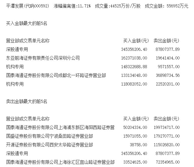 3月30日拉出第一个涨停板的平潭发展(000592),在3月31日继续保持强势,股价高开高走,并因涨停进入深交所公开信息当中。具体来看,成都著名游资席位国泰海通证券股份有限公司成都北一环路证券营业部现身买入席位当中,买入金额高达1.33亿元,折合约1060万股。除该席位外,平潭发展还吸引了两家机构专用席位的青睐,机构合计买入高达2130万股。虽然平潭发展连拉涨停板,但短线游资追涨热情依旧高涨,机构投资者也参与其中。