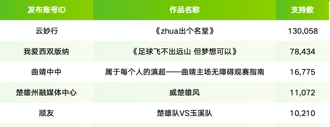 这些作品或聚焦民间热爱、或传递足球梦想、或关注公益观赛、或展现城市足球风采,用真实镜头诠释滇超精神,收获全网超高人气。本次大赛第一赛季全网话题曝光破1600万,抖音平台浏览量超1505万,用创意点燃云南足球热情!