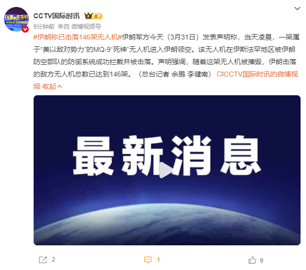 据CCTV国际时讯,伊朗军方今天(3月31日)发表声明称,当天凌晨,一架属于“美以敌对势力”的MQ-9“死神”无人机进入伊朗领空。该无人机在伊斯法罕地区被伊朗防空部队的防御系统成功拦截并被击落。声明强调,随着这架无人机被摧毁,伊朗击落的敌方无人机总数已达到146架。