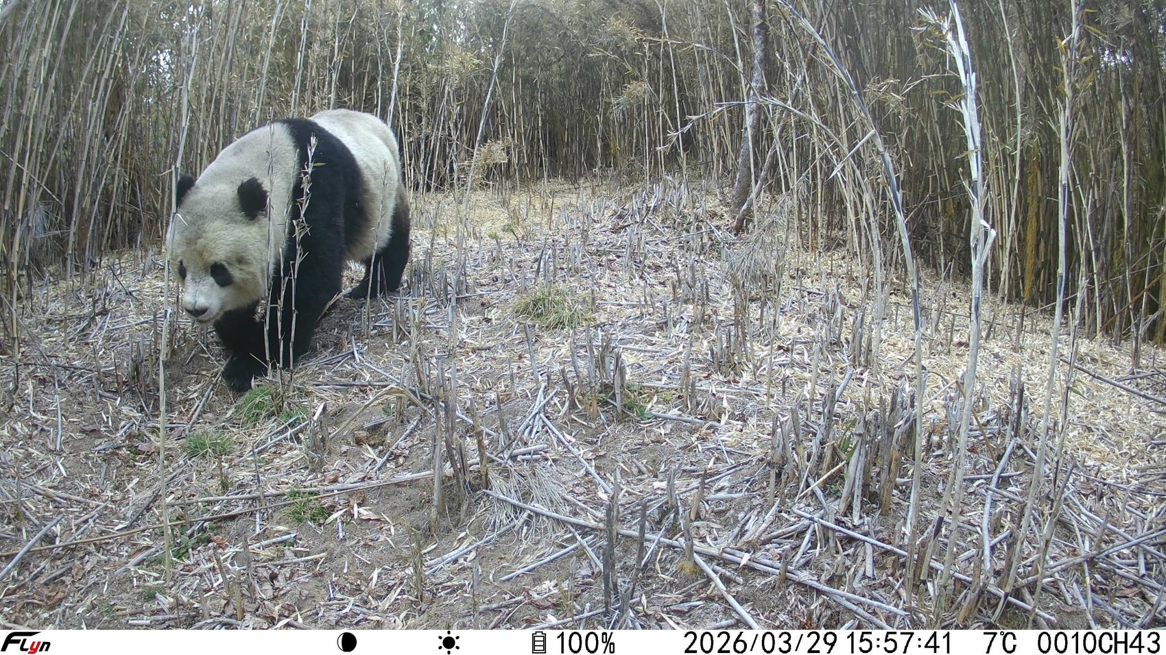 3月29日,四川申果庄省级自然保护区108区域的红外相机,再次清晰地拍摄到一只野生大熊猫的活动身影。这只黑白相间的 “国宝”在箭竹林间从容漫步,神态放松自然。经保护区工作人员反复比对,确认它正是此前多次在该区域被记录到的亚成体大熊猫。