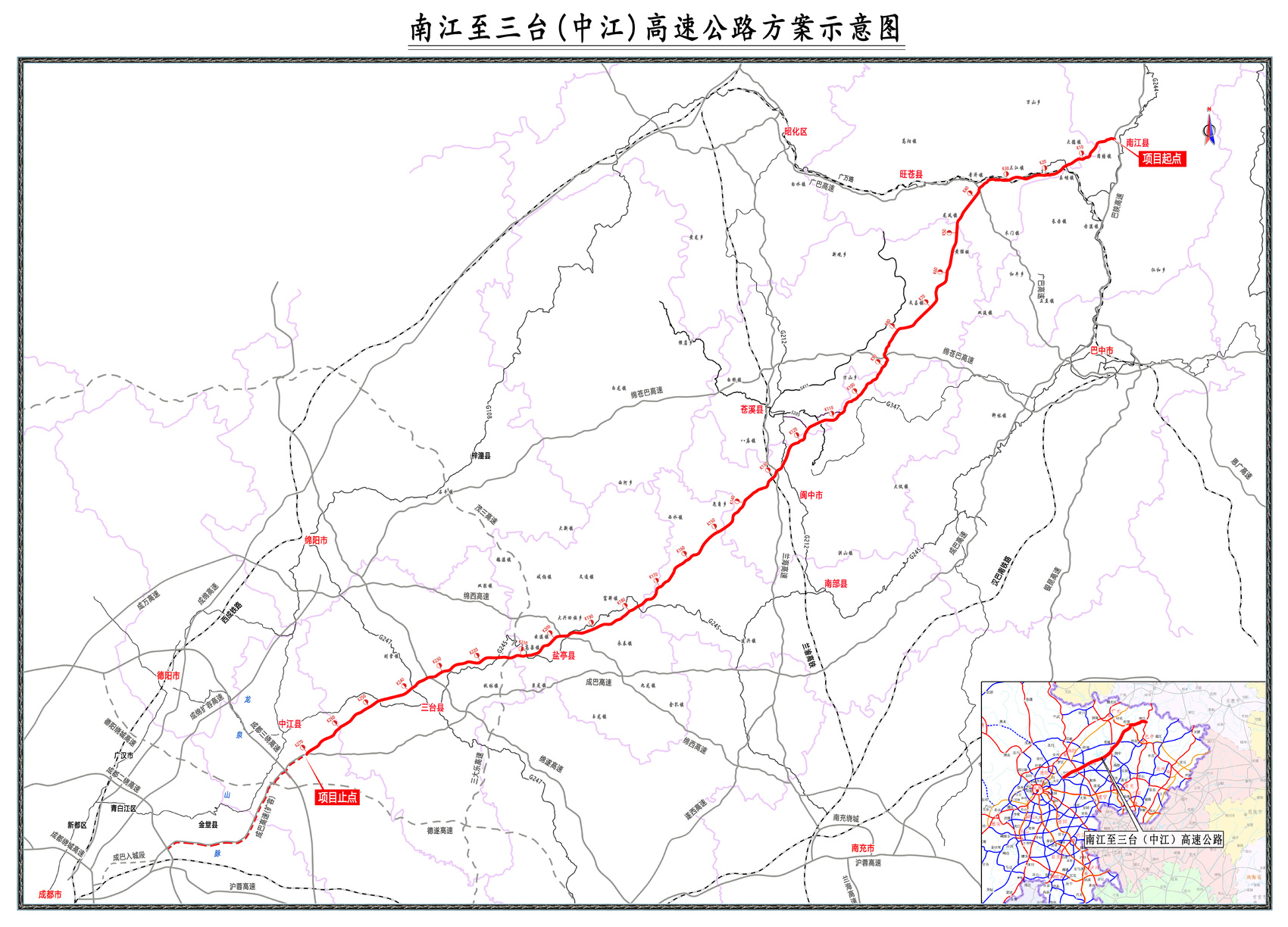 南三高速是成都平原经济区通往川东北经济区和陕西的大通道,项目路线起于G85银昆高速南江枢纽互通,串联巴中、广元、南充、绵阳、德阳5市的南江、苍溪、旺苍、南部、阆中、三台、盐亭、中江等8个县(市),止于G8516巴成高速中江枢纽互通。路线全长约271公里,总投资约487亿元。