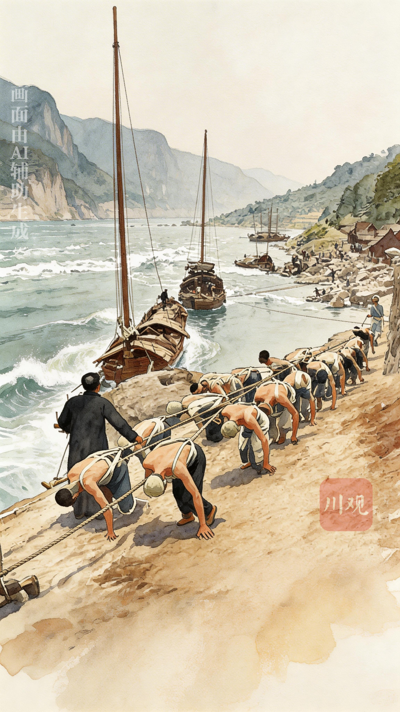 即便没有险情发生,急水的巨大冲力,也让船工们不敢有丝毫松懈。他们身体前倾,与地面近乎平行,单手触地,双脚蹬地,亦步亦趋,一摇一摆地艰难前行。还得自己给自己鼓劲,震天的号子吼起来。
