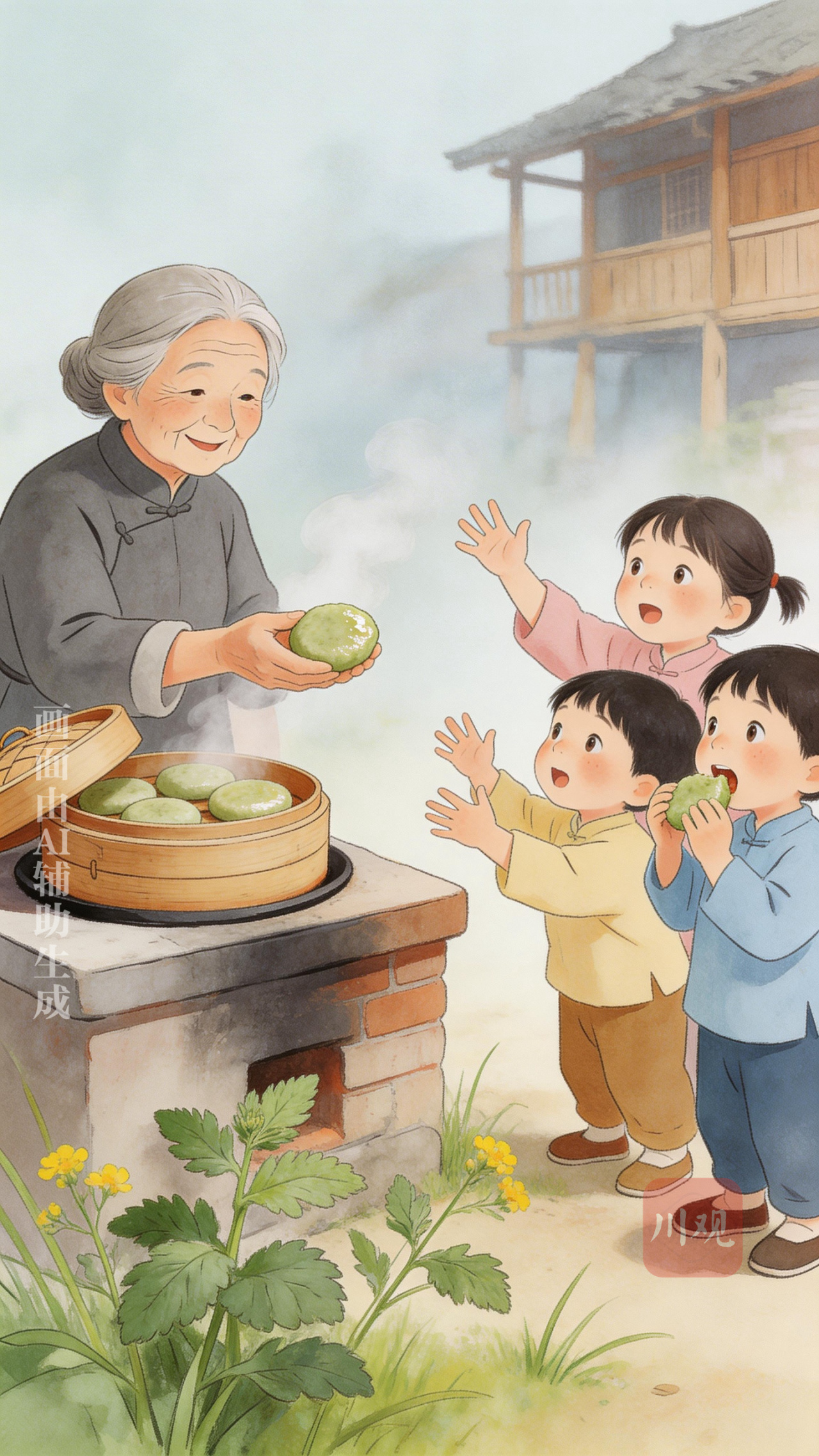 屋外传来孩子们的嬉闹声。小孩子们循着香味跑来,眼巴巴地望着灶台上的蒸笼。“清明菜粑,清明菜粑,吃了不忘祖宗家。”他们唱着不知传了多少代的童谣,小手伸得老长。