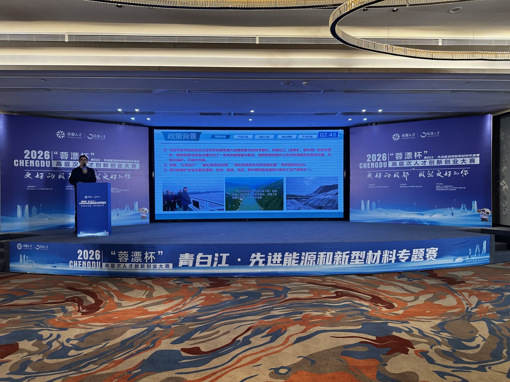 本场比赛是“蓉漂杯”高层次人才创新创业大赛系列比赛之一,精准集聚先进能源、新型材料重点产业优质项目与顶尖人才,旨在以赛引才、以赛聚智、以赛促产。今年2月底,青白江区开始征集参赛项目,来自上海市、福建省厦门市、湖北省武汉市等全国多个城市的上百个项目参赛。经前期专家盲选评审,最终选出AlGaN光源材料、纳米纤维生产装备、超疏水防护涂层等14个项目进入现场路演比拼环节,覆盖航空航天用特种材料、动力电池电解液、钒基功能高分子材料等细分领域。