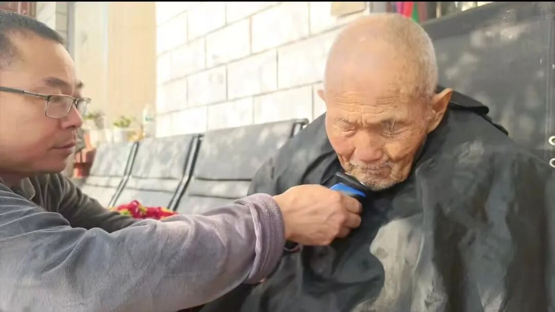 ▲去年11月,王合厂给父亲剃胡子(视频截图)。受访者提供