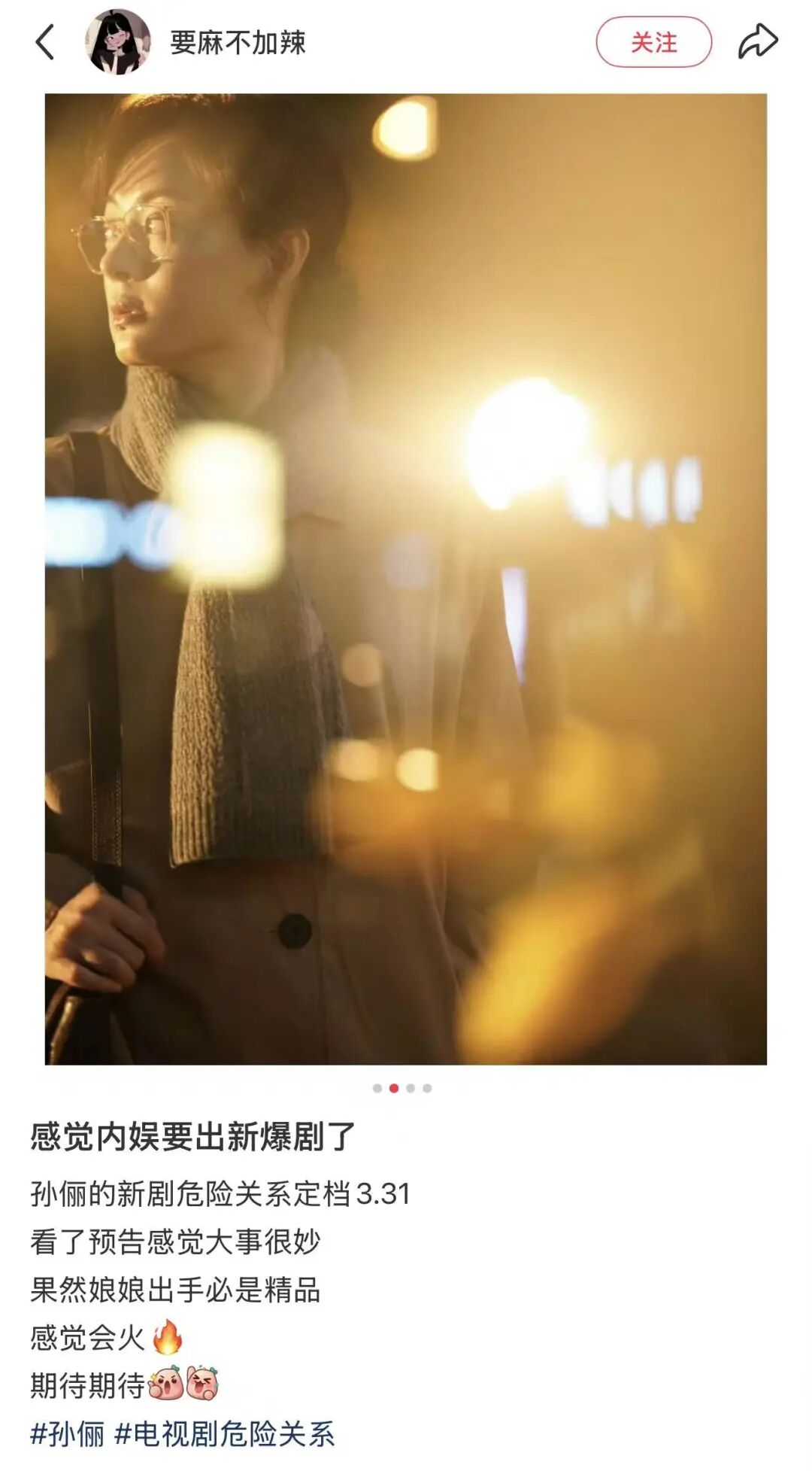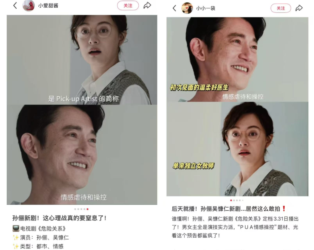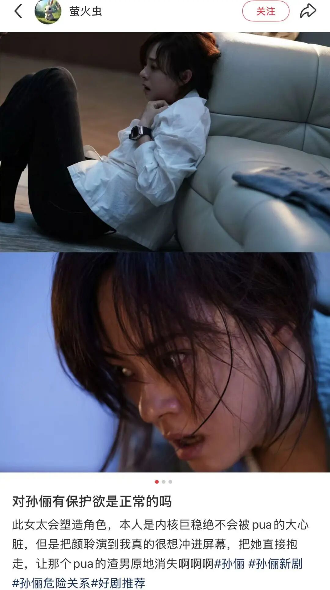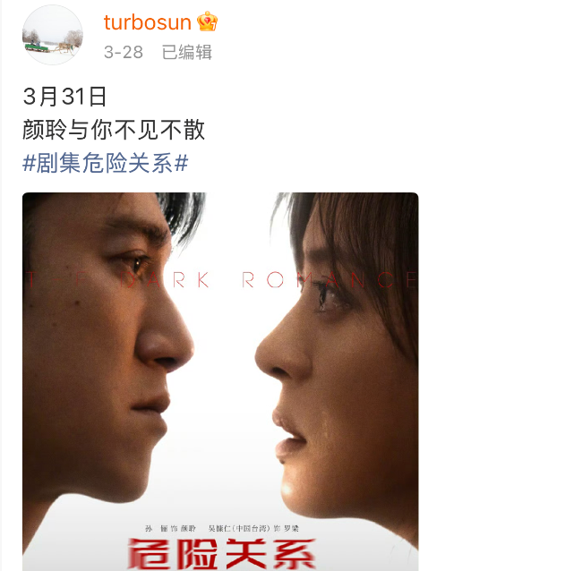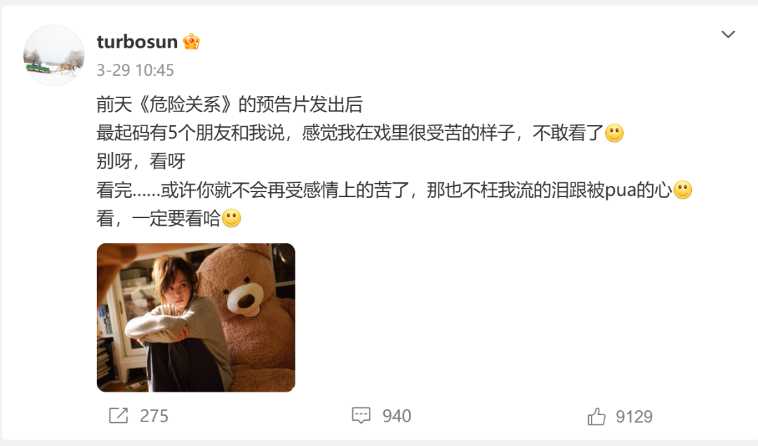 孙俪透露,新剧《危险关系》预告发布后,至少有5位朋友因剧中她“受苦的样子”不敢追剧。对此,她在微博回应:“别呀,看呀!看完……或许你就不会再受感情上的苦了,那也不枉我流的泪跟被pua的心。看,一定要看哈。”