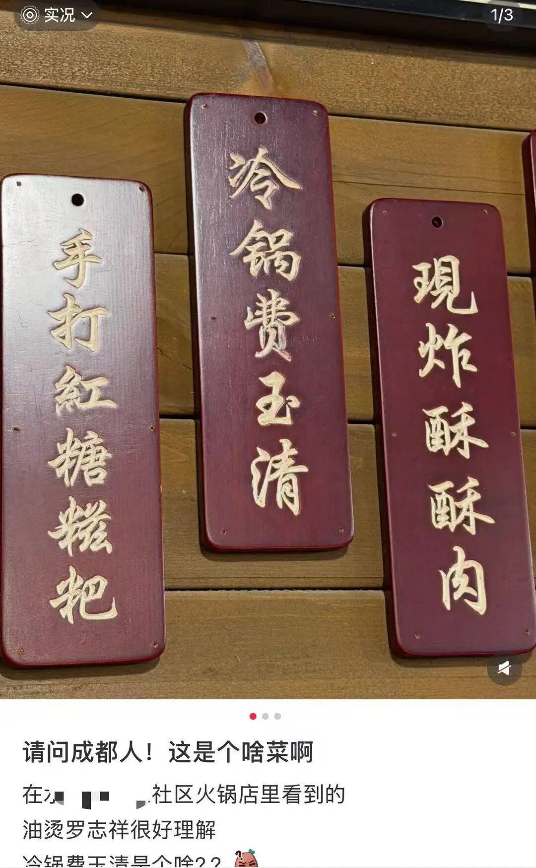 火锅店的菜名,往往在菜单上就能一目了然,但成都一家社区火锅店,最近却因为菜名引发网友关注。在店家提供的菜单中,除了手打红糖糍粑、现炸酥肉之外,还有“冷锅费玉清”和“油烫罗志祥”,令网友们对这样的菜名产生好奇,有网友发出疑问:“这是个啥菜啊”?