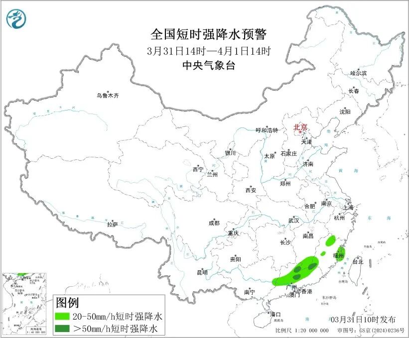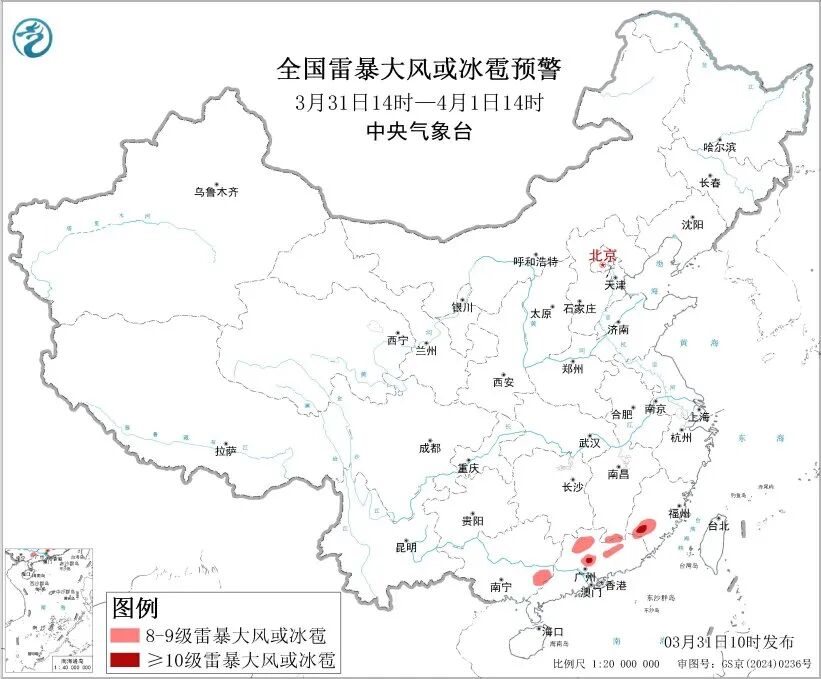 预计3月31日14时至4月1日14时,华南地区中北部、江南南部等地的部分地区将有8级以上雷暴大风或冰雹天气,其中,福建西南部、广东中部等地的部分地区将有10级以上雷暴大风,最大风力可达11级以上;华南中北部、江南东部和南部等地的部分地区将有小时雨量大于20毫米的短时强降水天气,其中,江西南部、福建西南部、广东中北部等地的部分地区小时雨量大于50毫米,最大可达60毫米以上。