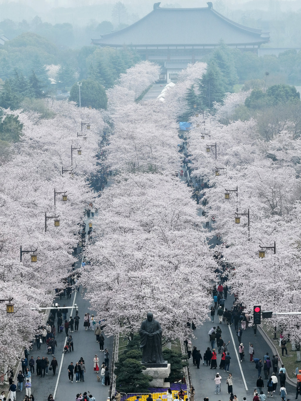 3月31日,游客在江苏省扬州市鉴真路上的“樱花大道”赏樱游玩(无人机照片)。