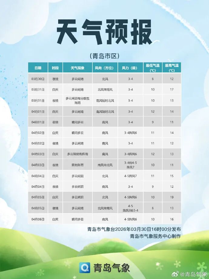 【青岛市区】今天夜间,多云间晴,北风3到4级,明天白天,多云间晴,北风转南风3到4级,相对湿度30%-70%,明天最低气温8℃,最高气温17℃。