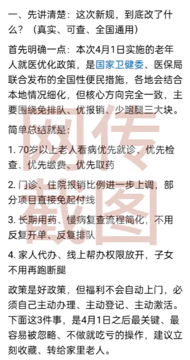 在《医疗保障基金使用监督管理条例实施细则》中,没有提及有关70岁以上老人看病的相关政策。部分自媒体文章中写到的“4月1日起全国统一提高报销比例”“不备案就无法享受优待”“就医需同时出示医保凭证及本人身份证件”均为不实信息。