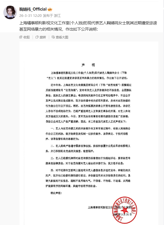 鞠婧祎方面表示,对丝芭传媒对艺人做出的“诽谤行为”,“我方绝不姑息”。