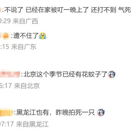 “睡个觉,10个手指被叮了3”“连续一周后半夜被蚊子叮咬痒醒了”“昨晚跟蚊子周旋到4点都还没睡”“上星期开始已经蚊子成堆了”……社交平台上,IP为广东或广西的网友率先开始了蚊子的吐槽大会。有广东网友表示,其实整个冬天,蚊子都没消停,冷空气一过,就开始闹腾。