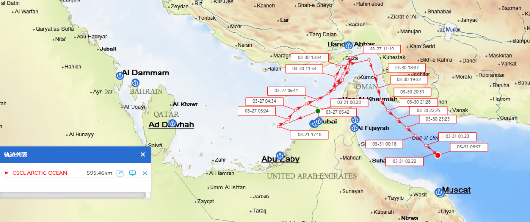 深圳报业集团记者查询船舶追踪数据系统得知,北京时间3月30日傍晚,“中海北冰洋”号与“中海印度洋”号从迪拜附近海域起锚,沿着伊朗最大岛屿格什姆岛与腊克岛之间的航线,以10.4节左右的航速,通过霍尔木兹海峡狭窄的出口,随后驶入阿曼湾水域。船舶追踪数据系统显示,这两艘船只预计4月6日抵达马来西亚的巴生港。