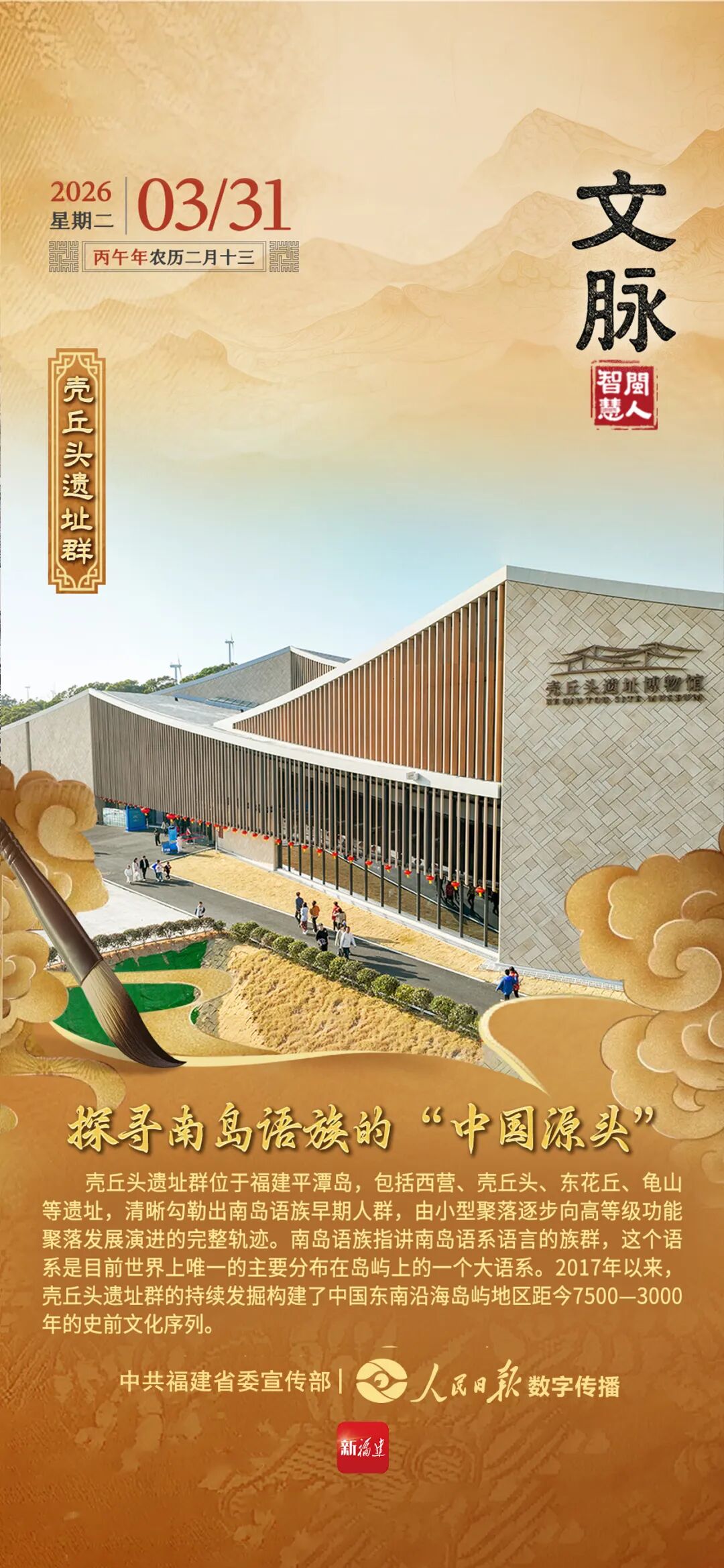 壳丘头遗址群位于福建平潭岛,包括西营、壳丘头、东花丘、龟山等遗址,清晰勾勒出南岛语族早期人群,由小型聚落逐步向高等级功能聚落发展演进的完整轨迹。南岛语族指讲南岛语系语言的族群,这个语系是目前世界上唯一的主要分布在岛屿上的一个大语系。2017年以来,壳丘头遗址群的持续发掘构建了中国东南沿海岛屿地区距今7500—3000年的史前文化序列。