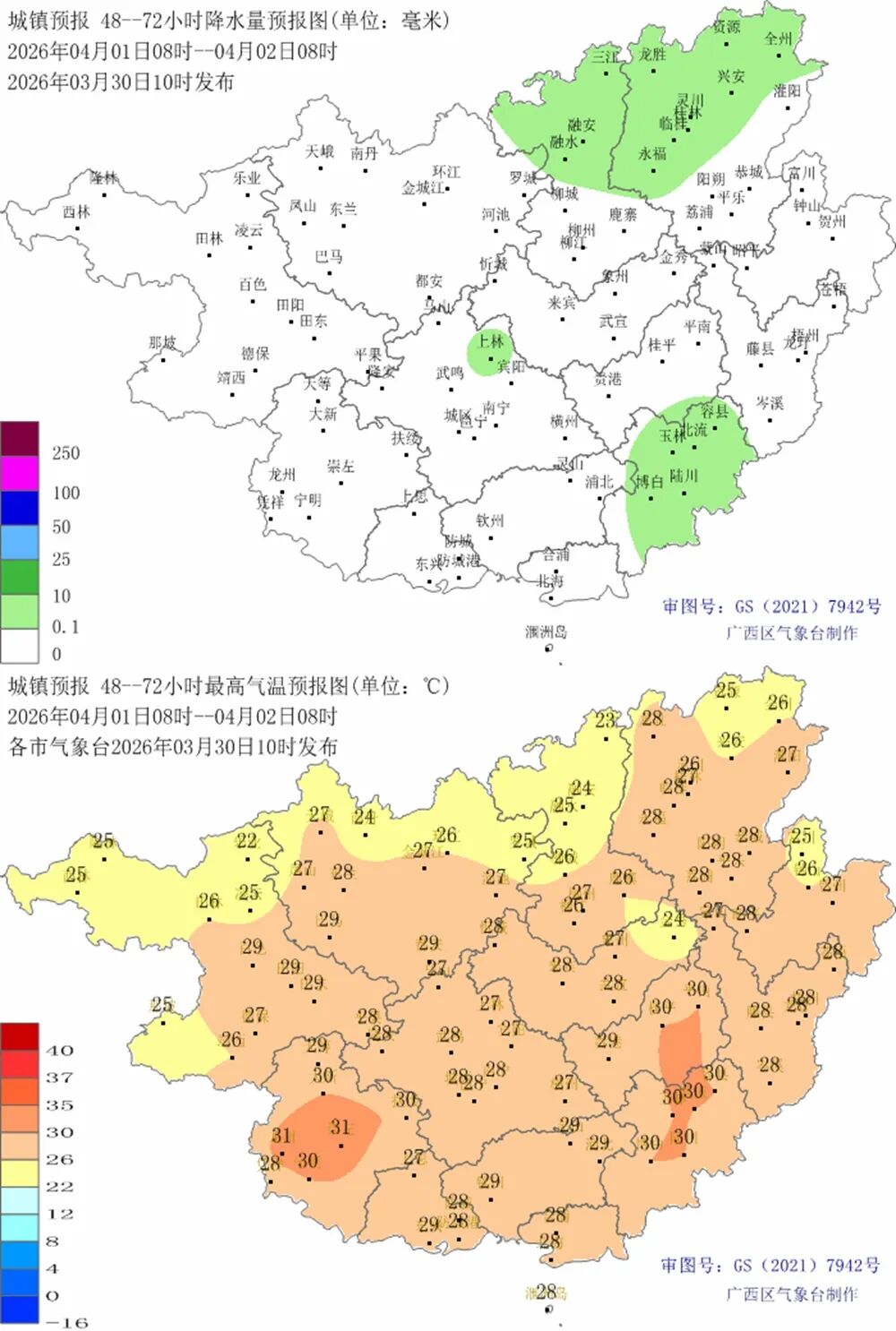 4月1日晚上到4月2日白天,桂东阴天部分地区有小雨,桂西多云到阴天、局地有小雨。