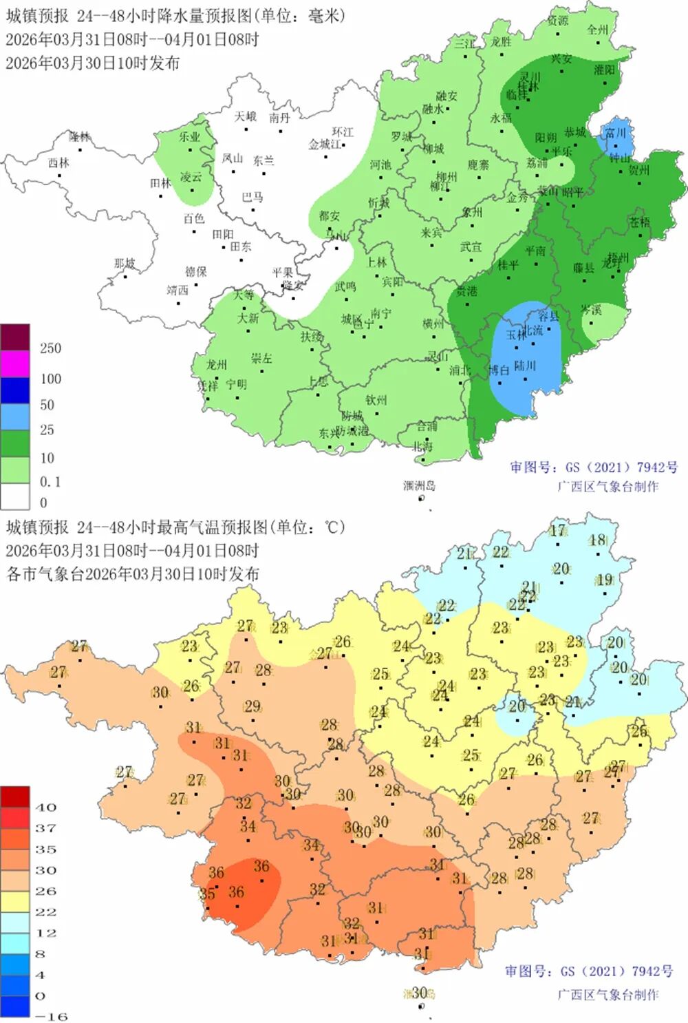 明天(31)白天,贺州、梧州、来宾、贵港、玉林等市及柳州、桂林两市南部阴天有小到中雨、局地大雨或暴雨并伴有短时雷暴大风、冰雹等强对流天气,其他地区多云到阴天有分散阵雨或雷雨。