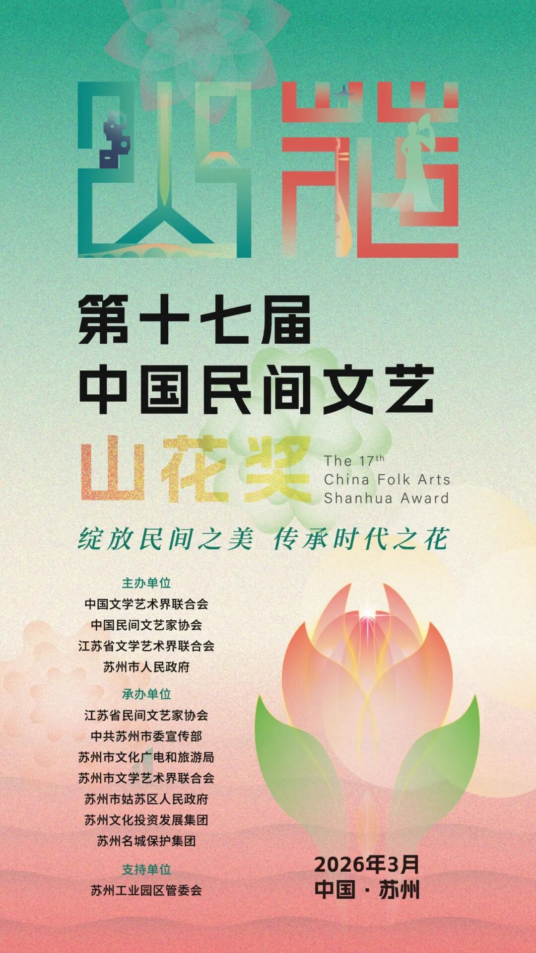 第十七届中国民间文艺山花奖颁奖典礼将于今晚19:30在苏州文化艺术中心大剧院举行,颁奖典礼以“寻脉山河 花开烂漫”为主题。中国艺术报视频号届时将进行直播,欢迎观看!