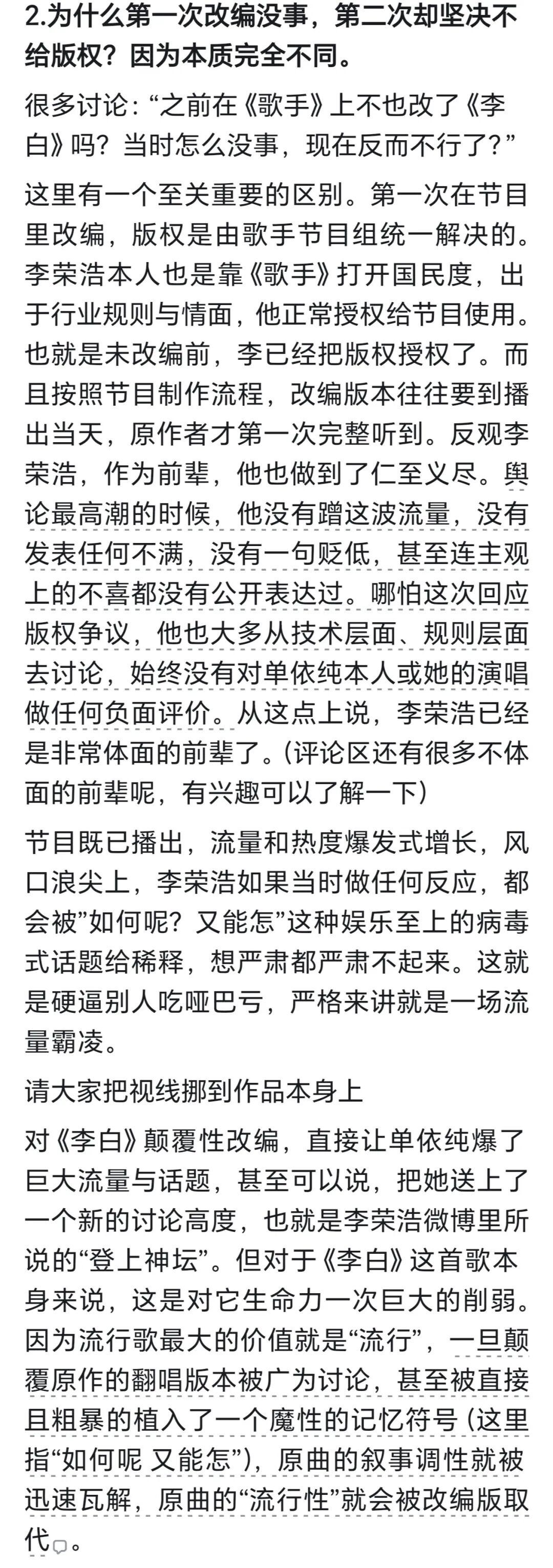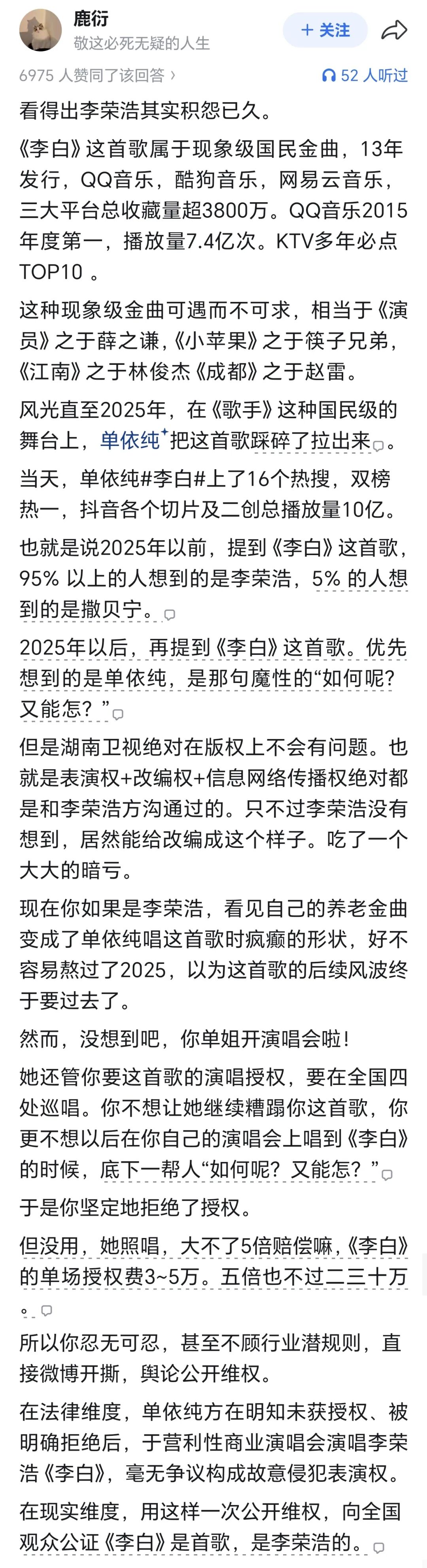 2026年3月29日,歌手李荣浩的一篇微博,在全网掀起了轩然大波。他直指单依纯在个人演唱会上,未经授权便演唱了自己的原创作品《李白》。明明之前已明确拒绝授权,为何商业演出仍执意演唱?这场持续发酵的版权争议,究竟是侵权行为还是一场误会?接下来,我们将引用知乎答主的观点,完整梳理这一事件的始末。