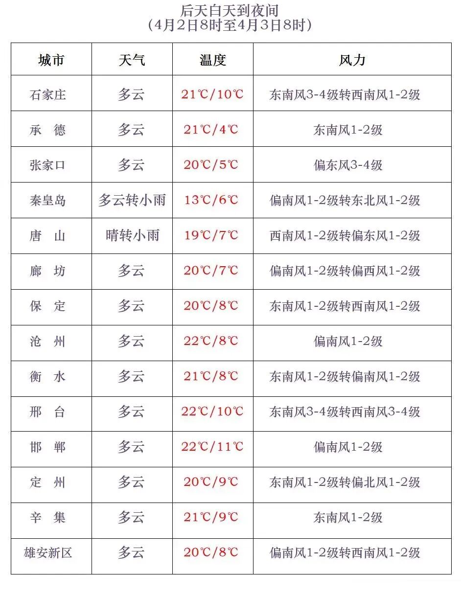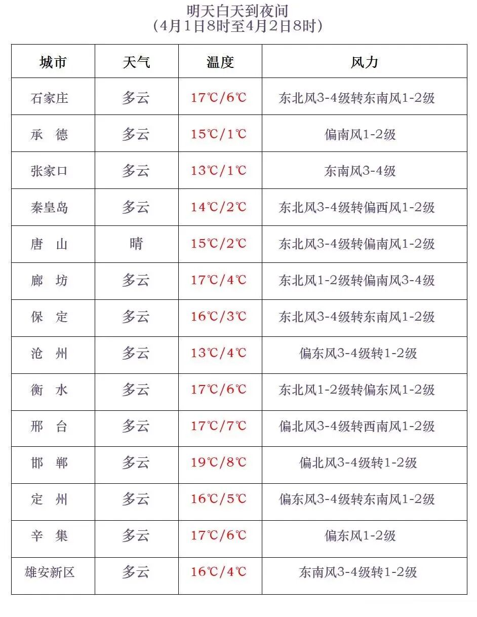 河北省气象台2026年3月31日11时发布天气预报: