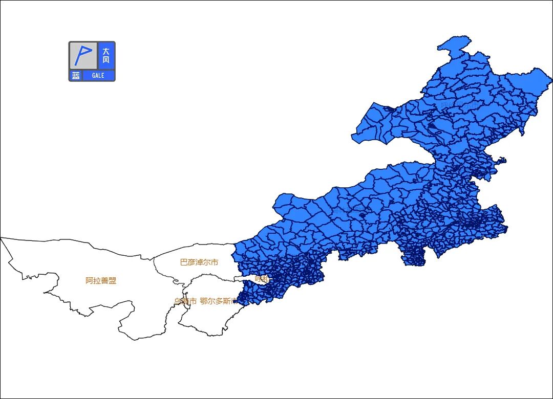 今天,新一轮冷空气又来袭扰内蒙古,西部偏东及中东部大部地区大风上线,多地平均风力可达6级以上,阵风7~8级,其中,锡林郭勒盟西北部、呼伦贝尔市西南部阵风风力可达9级以上。为此,内蒙古自治区气象台已于今日9时45分发布大风蓝色预警信号,请注意防范。