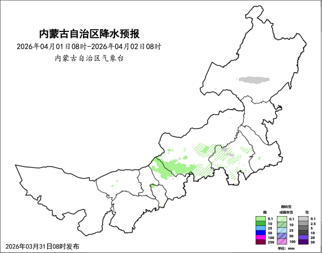 预计,今明两天(3月31日—4月1日)受冷空气影响,内蒙古中部偏东及东部大部地区气温明显下降,局地降温8~12℃,多地大风相伴,风寒效应明显,公众需及时添衣保暖,谨防受寒感冒。同时,今明两天,内蒙古降水较为分散,多地有分散性小雨、雨夹雪或小雪天气出现,东北部局地有中雪。另外,2日夜间起至5日还有强冷空气携带风雪降温来袭。时值清明假期,公众需密切关注临近预报信息,合理安排出行计划。