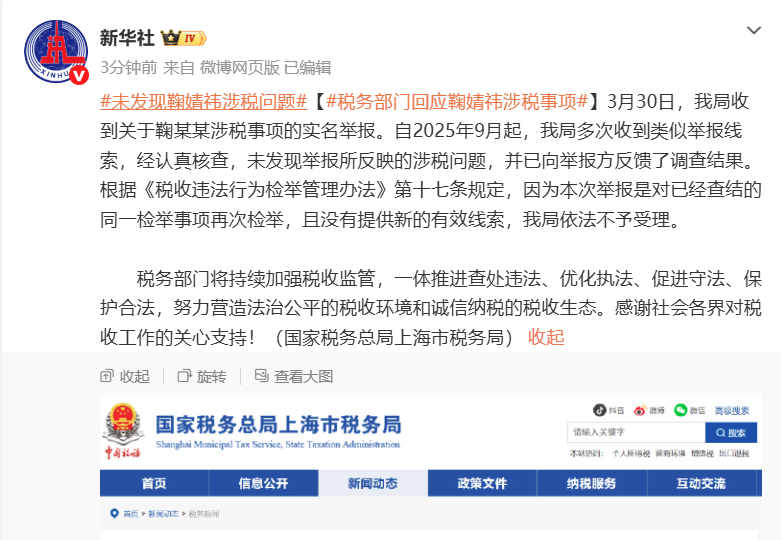 3月30日,我局收到关于鞠某某涉税事项的实名举报。自2025年9月起,我局多次收到类似举报线索,经认真核查,未发现举报所反映的涉税问题,并已向举报方反馈了调查结果。根据《税收违法行为检举管理办法》第十七条规定,因为本次举报是对已经查结的同一检举事项再次检举,且没有提供新的有效线索,我局依法不予受理。