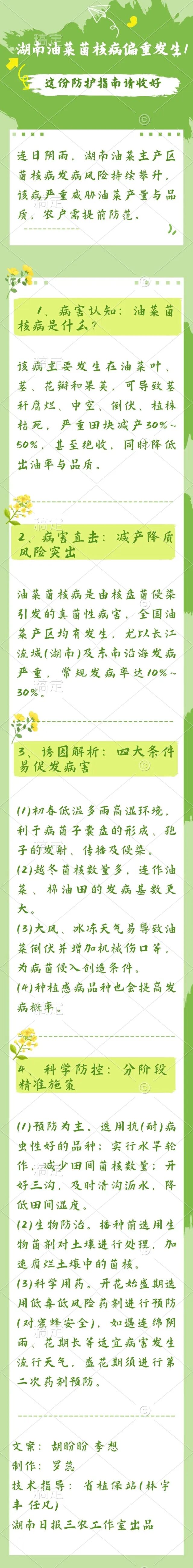 据悉,油菜菌核病是由核盘菌侵染引发的真菌性病害,全国油菜产区均有发生,尤以长江流域(湖南)及东南沿海发病严重,常规发病率达10%~30%。该病主要发生在油菜叶、茎、花瓣和果荚,可导致茎秆腐烂、中空、倒伏、植株枯死,严重田块减产30%~50%,甚至绝收,还会降低油菜籽的出油率与品质。初春低温多雨高湿环境下,利于病菌子囊盘的形成,以及孢子的发射和传播,油菜侵染菌核病的风险增加。