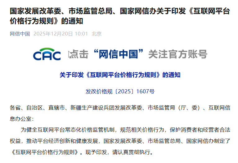 为深入贯彻落实党的二十大和二十届历次全会精神,推动平台经济创新和健康发展,国家发展改革委、市场监管总局、国家网信办联合发布《互联网平台价格行为规则》,自2026年4月10日起施行,有效期为5年。