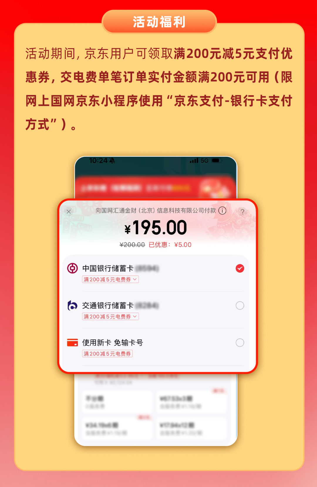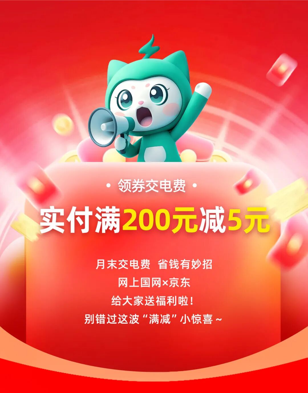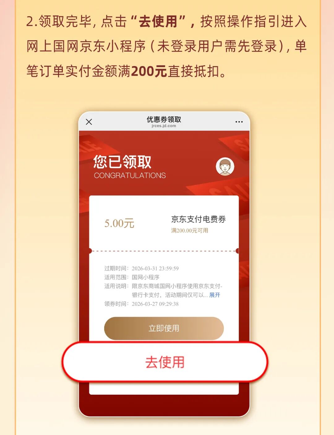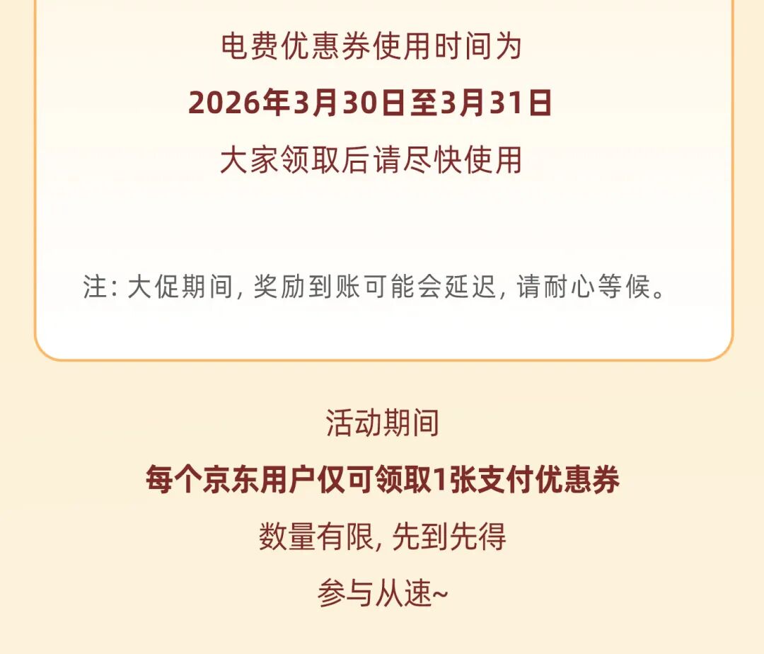 3月30日—31日打开网上国网京东小程序限时领券交电费实付200元减5元