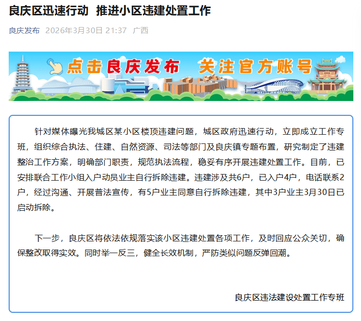 针对媒体曝光我城区某小区楼顶违建问题,城区政府迅速行动,立即成立工作专班,组织综合执法、住建、自然资源、司法等部门及良庆镇专题布置,研究制定了违建整治工作方案,明确部门职责,规范执法流程,稳妥有序开展违建处置工作。目前,已安排联合工作小组入户动员业主自行拆除违建。违建涉及共6户,已入户4户,电话联系2户,经过沟通、开展普法宣传,有5户业主同意自行拆除违建,其中3户业主3月30日已启动拆除。