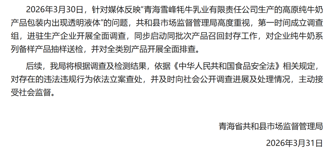 3月31日,青海省共和县市场监督管理局发布情况通报:3月30日,针对媒体反映“青海雪峰牦牛乳业有限责任公司生产的高原纯牛奶产品包装内出现透明液体”的问题,共和县市场监督管理局高度重视,第一时间成立调查组,进驻生产企业开展全面调查,同步启动同批次产品召回封存工作,对企业纯牛奶系列备样产品抽样送检,并对全类别产品开展全面排查。后续,我局将根据调查及检测结果,依据《中华人民共和国食品安全法》相关规定,对存在的违法违规行为依法立案查处,并及时向社会公开调查进展及处理情况,主动接受社会监督。据此前报道,3月30日,消费者王先生反映其收到的青海湖牌高原纯牛奶倒出透明苦味液体,连续4盒均现异常。涉事产品配料仅标注生牛乳。目前,厂家表示将追溯生产环节,青海当地市场监管局:立即前往涉事企业,开展全面核查。