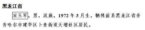 宋玉军,1972年3月生,牺牲前系黑龙江省齐齐哈尔市建华区卜奎街道天增社区居民。