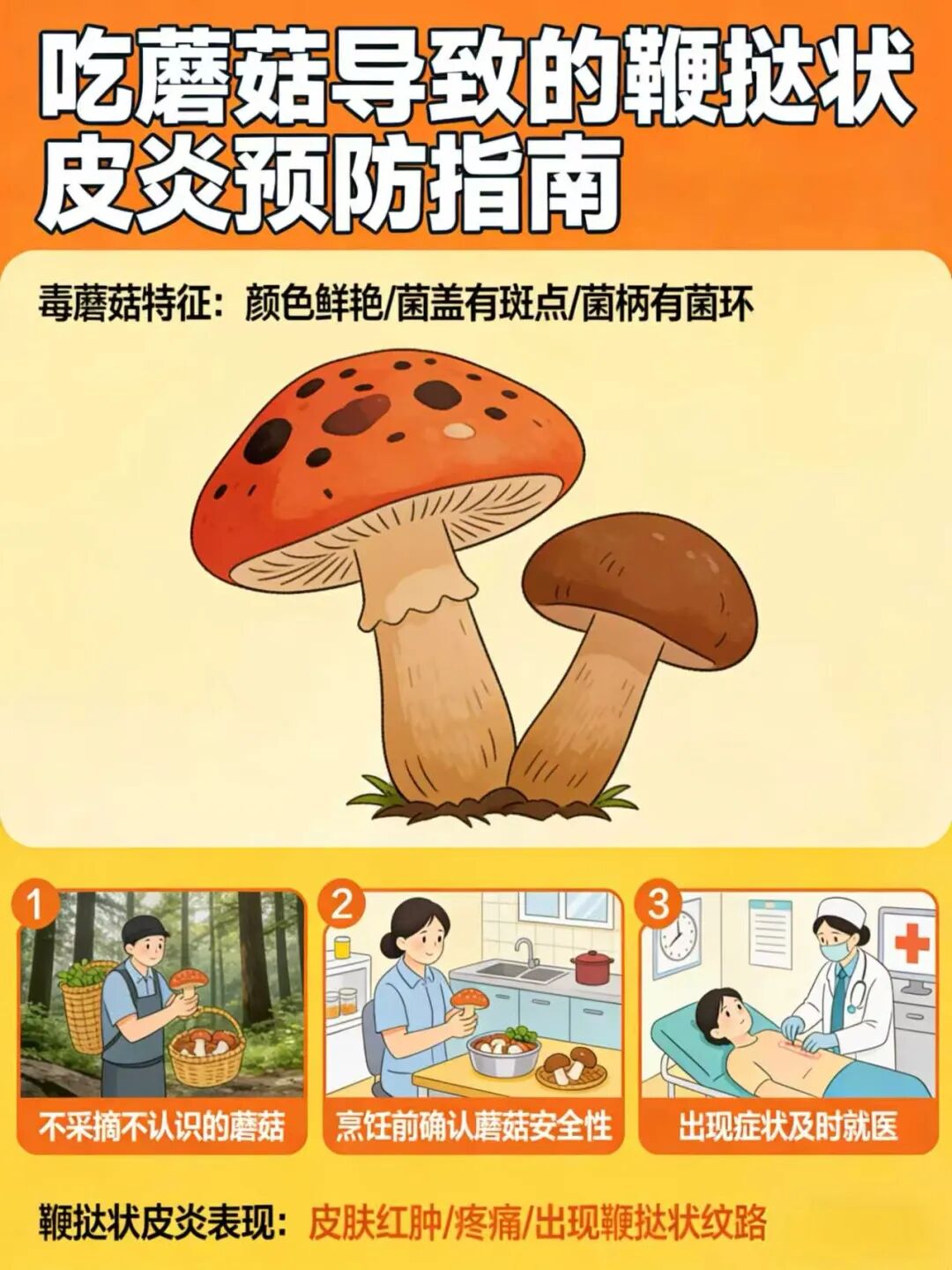 如果吃完蘑菇后(尤其是12~24小时内),身上突然出现条索状、凸起的红斑,伴随剧烈瘙痒,请高度怀疑此病,并立即前往医院皮肤科就诊。