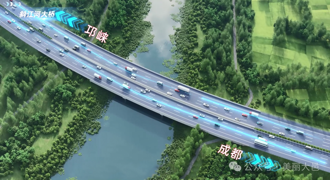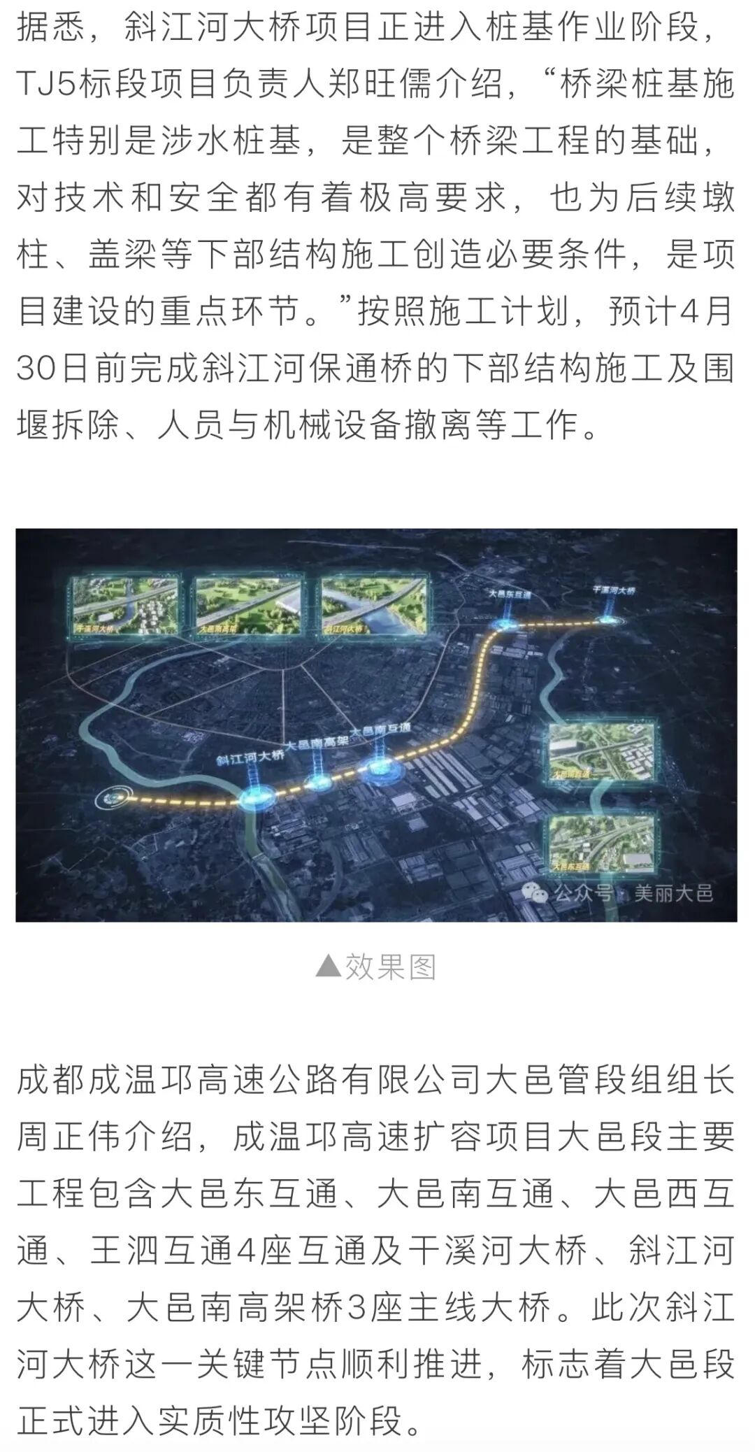 作为成温邛高速扩容项目大邑段重要控制性工程之一,斜江河大桥现有桥梁宽24米、长225米,扩容后将拓宽至41米、延长至249米,实现双向八车道通行,通行能力与行车安全性将大幅增强。
