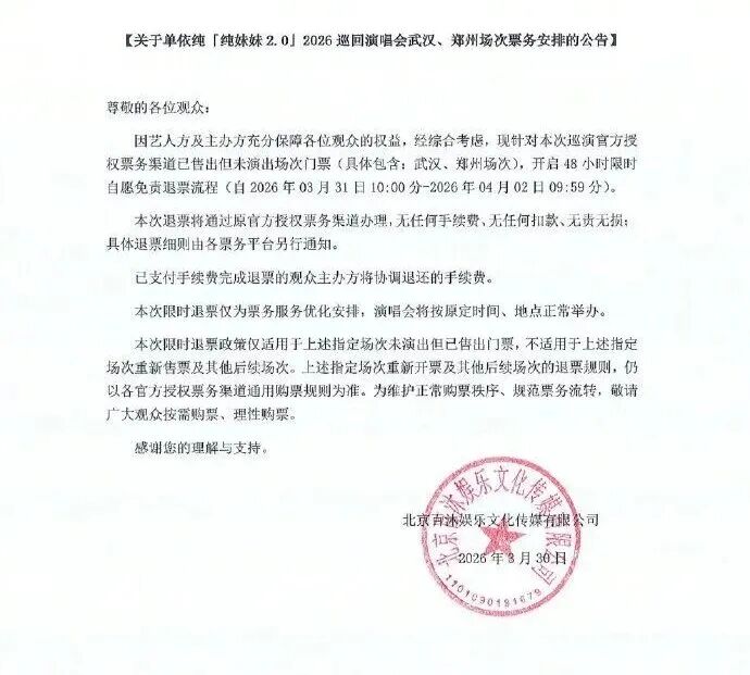 3月30日,单依纯本次巡演的主办方北京百沐娱乐文化传媒有限公司@百沐娱乐 发布公告:经综合考虑,针对@单依纯 「纯妹妹2.0」2026巡回演唱会官方授权票务渠道已售出但未演出场次门票(具体包含:武汉、郑州场次),开启48小时限时自愿免责退票流程(自2026年03月31日10:00—2026年04月02日09:59)。