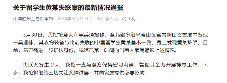 3月30日,我馆接意大利宪兵通报称,意北部多洛米蒂山区富内斯山谷雪地中发现一具遗体,其衣物装备与此前失联的中国留学生黄某基本一致,身上发现黄某护照。目前,意方需进一步确认身份。我馆已第一时间向当事人家属通报上述情况。