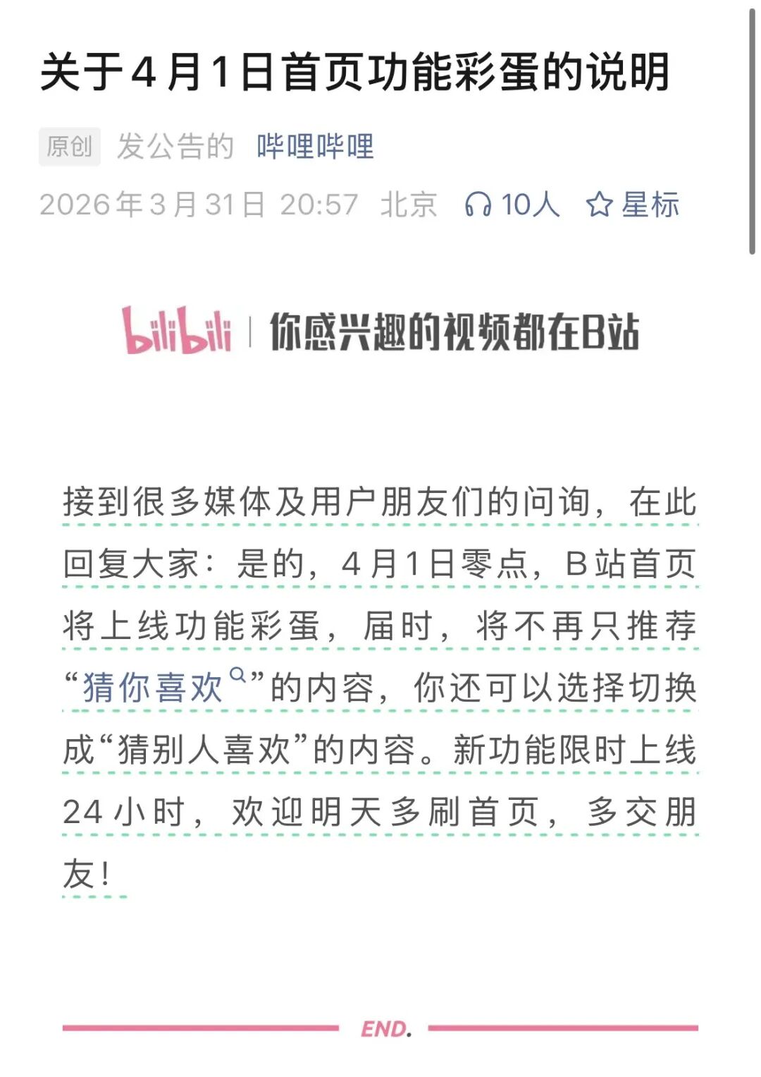 3月31日晚,“哔哩哔哩”微信公号发布关于4月1日首页功能彩蛋的说明,全文如下: