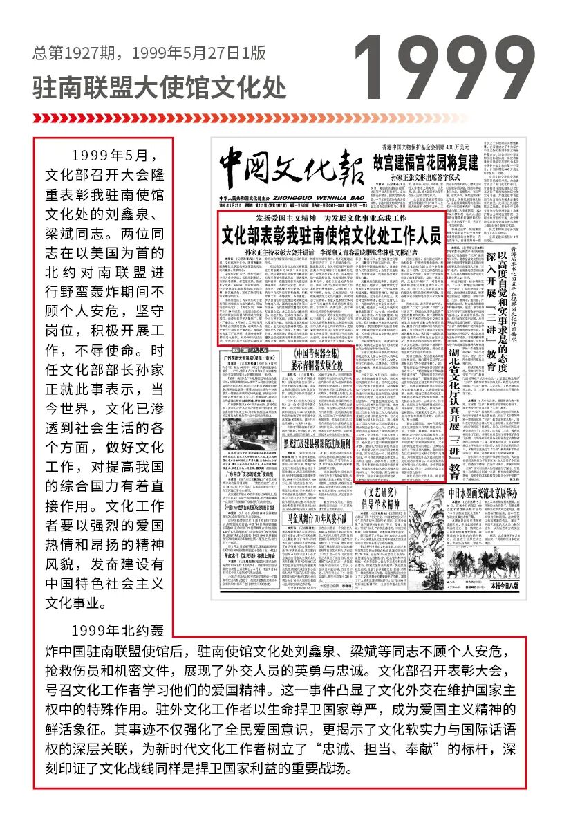 1999年5月,文化部召开大会隆重表彰我驻南使馆文化处的刘鑫泉、梁斌同志。两位同志在以美国为首的北约对南联盟进行野蛮轰炸期间不顾个人安危,坚守岗位,积极开展工作,不辱使命。时任文化部部长孙家正就此事表示,当今世界,文化已渗透到社会生活的各个方面,做好文化工作,对提高我国的综合国力有着直接作用。文化工作者要以强烈的爱国热情和昂扬的精神风貌,发奋建设有中国特色社会主义文化事业。