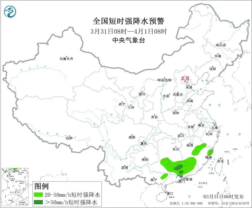 预计3月31日8时至4月1日8时,华南、江南南部等地的部分地区将有8级以上雷暴大风或冰雹天气,其中,江西南部、广东北部等地的部分地区将有10级以上雷暴大风,最大风力可达11级以上;华南、江南东部和南部等地的部分地区将有小时雨量大于20毫米的短时强降水天气,其中,广东中北部等地的部分地区小时雨量大于50毫米,最大可达60毫米以上。