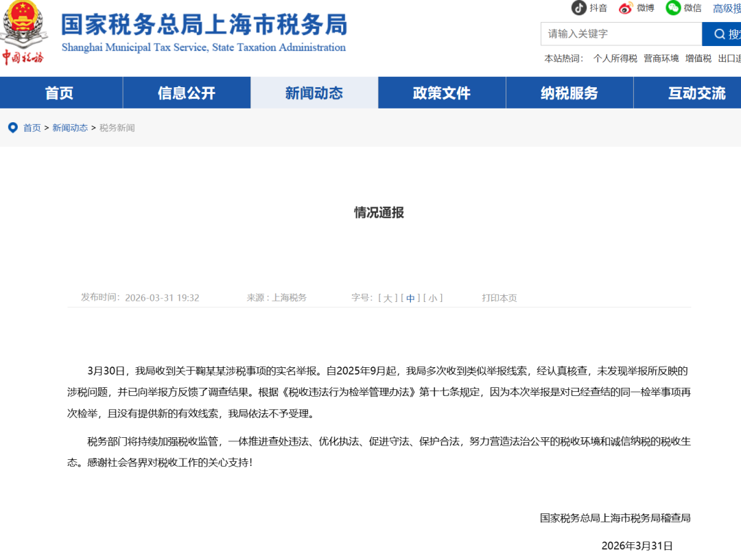 今晚(3月31日),国家税务总局上海市税务局稽查局发布“情况通报”称: