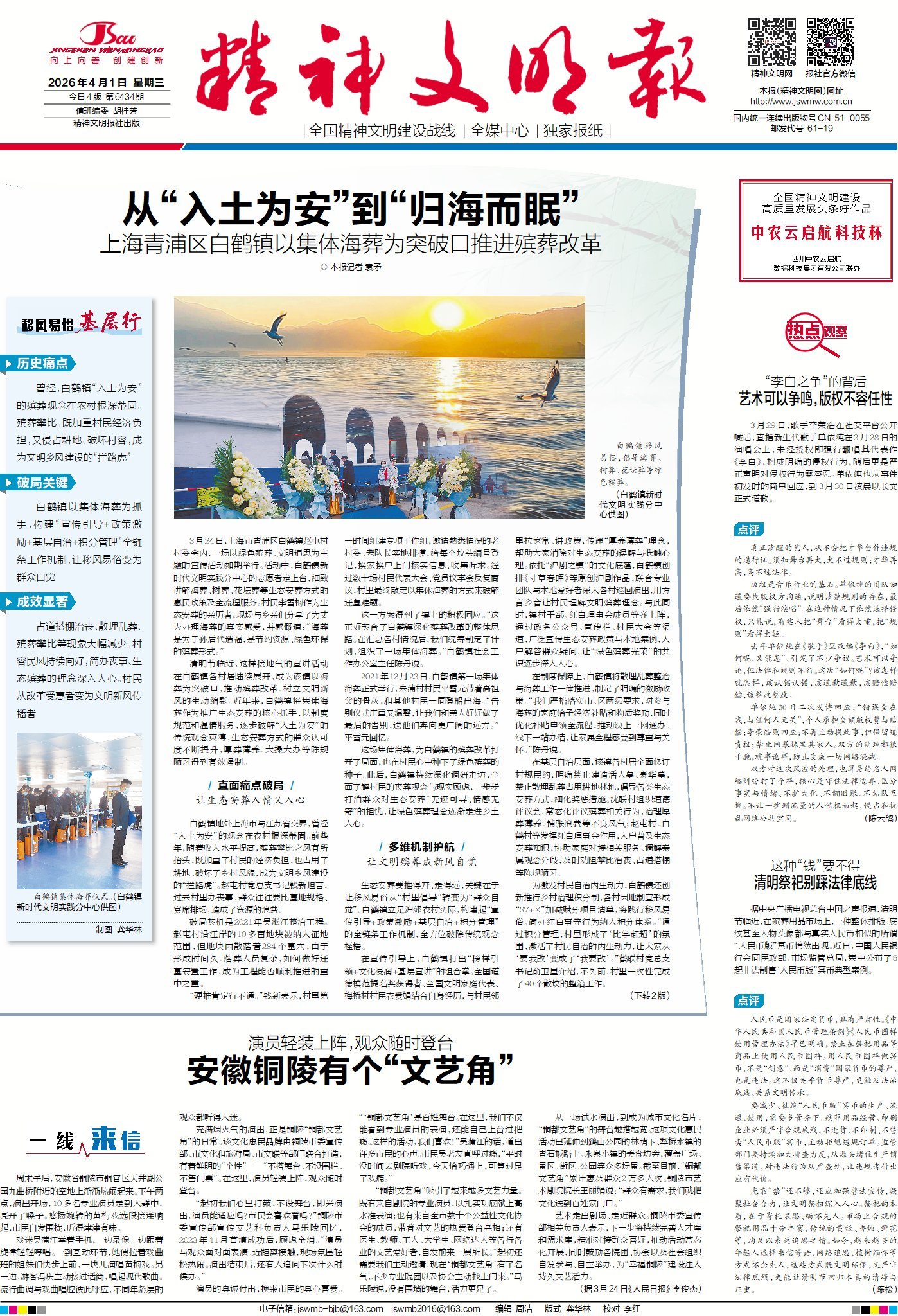 上海市青浦区白鹤镇地处沪苏交界,“入土为安”的殡葬观念曾根深蒂固。殡葬攀比,既加重村民经济负担,又侵占耕地、破坏村容,成为文明乡风建设的“拦路虎”。一场深刻的殡葬改革,打破传统桎梏,让“归海而眠”的绿色理念扎根乡土,厚葬薄养、大操大办等陈规陋习得到有效遏制,绿色殡葬、简办丧事的文明新风徐徐吹拂。这场改革也让村民从改革受益者变为文明新风传播者。请关注今日1版《移风易俗基层行》栏目,看上海市青浦区白鹤镇以海葬为突破口推进殡葬改革。