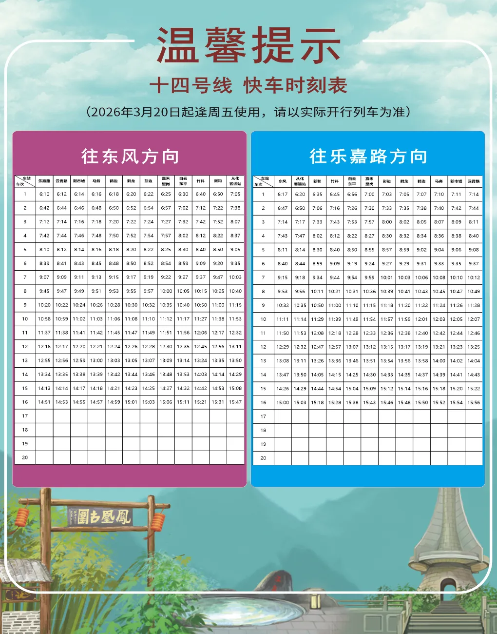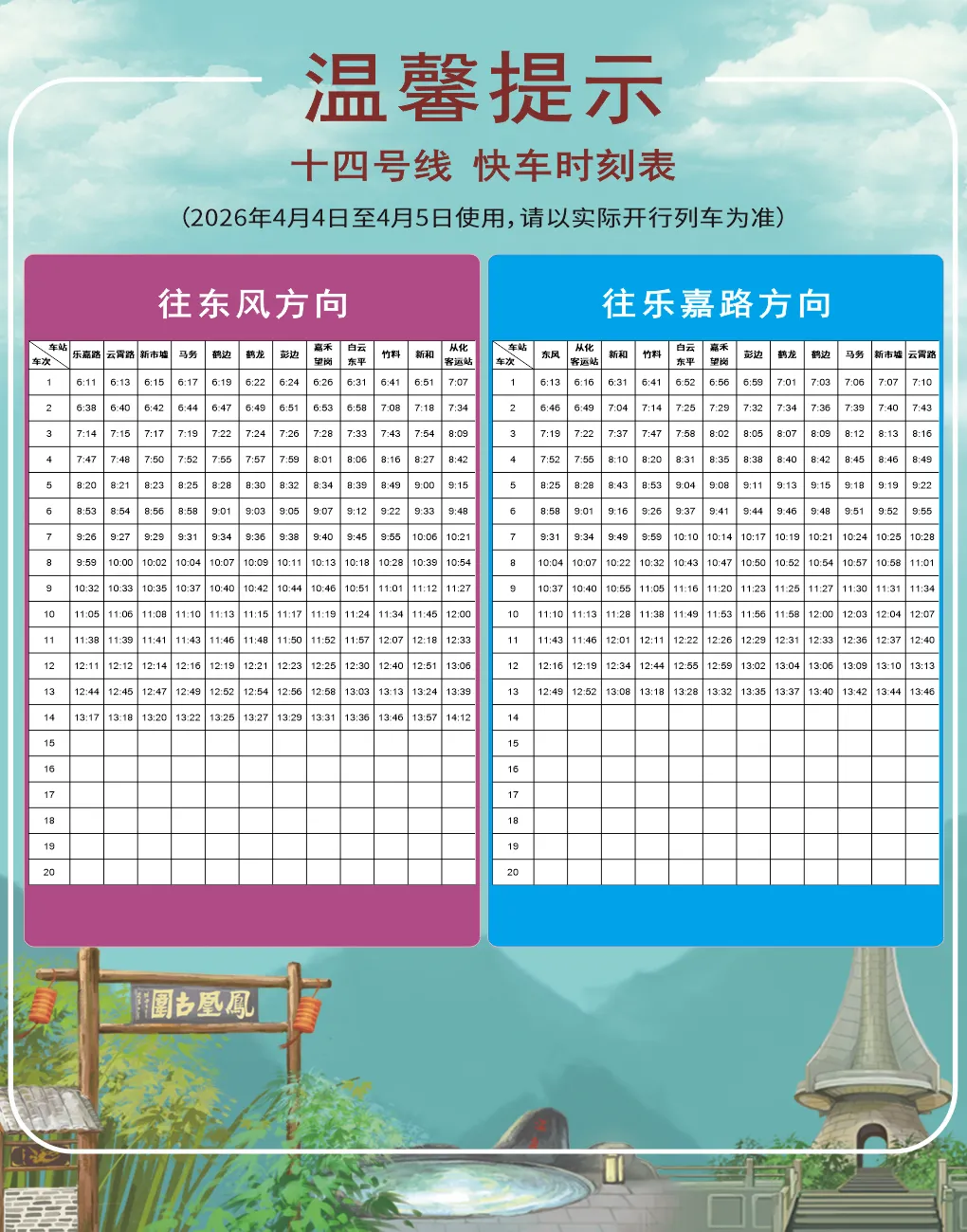 此外,4月3日12:00至运营结束、4月4日至6日13:20至运营结束,十四号线快车将调整为普通车运行。4月6日(假期最后一天),为方便师生集中返校,十四号线、二十一号线将采用大运力时刻表以疏导返校客流,其中十四号线14:00-21:30将加开“嘉禾望岗至太平”的短线车,进一步提升大客流区段的运输能力。