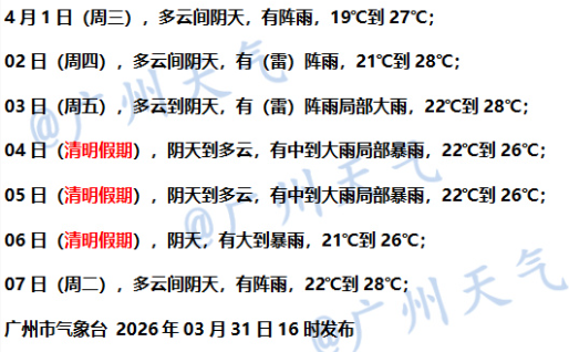 广州市气象台预计,4月1日—2日广州降水减弱,以多云为主,4月3日后降水再度增强,展望清明假期,广州仍有中到大雨。